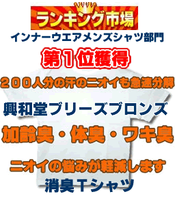 テレビでも紹介された200人分の汗の臭いもわずか5分で消臭してしまう興和堂ブリーズブロンズ繊維からいよいよ登場!イオン化結合による消臭革命を実現した体臭分解シャツ!どんなニオイを消臭してくれるの?みんなの悩み「汗臭・尿臭・ワキ臭・加齢臭」に対応!ずばり、消え